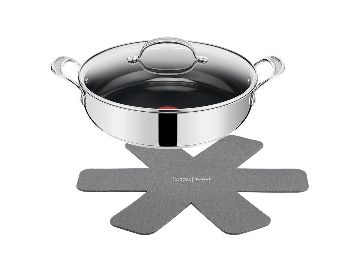 Oplev glæden ved madlavning med Jamie Oliver Classic Cook SS Ceramic stegepander – en perfekt balance mellem innovation og holdbarhed, designet til at gøre din madlavningsoplevelse både nem og behagelig. Med disse stegepander bliver hvert måltid en fornøjelse at tilberede, uanset om du er nybegynder i køkkenet eller en erfaren kok.Jamie Oliver Classic Cook SS Ceramic stegepander er udstyret med InoCeram keramisk non-stick belægning, hvilket gør både madlavning og rengøring nem at udføre. Den keramiske non-stick belægning sikrer, at dine ingredienser ikke brænder fast, hvilket betyder, at du kan tilberede dine yndlingsretter med mindre fedtstof. Stegepanderne er fremstillet af holdbart poleret rustfrit stål 18/10, hvilket gør, at disse stegepander ikke kun er æstetisk tiltalende, men også fremstillet til at holde. Med en base fremstillet af 90% genanvendt rustfrit stål foretager du også et miljøvenligt valg, hver gang du laver mad. Det nittede rustfrit stålhåndtag med silikoneindsats giver dig et professionelt, sikkert og køligt greb, der gør, at du kan håndtere panden med lethed og komfort. Thermo-Spot™-teknologien er en innovativ funktion, der viser, når stegepanden har nået den optimale temperatur til at begynde madlavning. Dette sikrer, at dine retter altid tilberedes ved den rigtige temperatur, hvilket giver dig perfekte resultater hver gang. Derudover er stegepanden udstyret med en Thermo-Fusion™ integreret induktionsbase, hvilket skaber en jævn varmefordeling i bunden, og det gør den egnet til alle typer komfurer, inklusiv induktion.PlejeinstruktionerFor at beskytte den keramiske non-stick belægning mod ridser og stød medfølger en praktisk pandebeskyttelse. For at forlænge levetiden på din stegepande, skal du følge disse enkle plejeinstruktioner: undgå at overophede din pande og lad den køle helt af, før du vasker den for at undgå termisk chok. Brug altid træ- eller plastikredskaber for at beskytte belægningen, og opbevar panden omhyggeligt for at minimere stød. Jamie Oliver Classic Cook SS Ceramic stegepander er ikke kun et redskab, men en partner i dit køkken, der hjælper dig med let at skabe lækre og næringsrige måltider. Lad din madlavningsrejse begynde med Tefal og Jamie Oliver – til hvert måltid, hver dag.